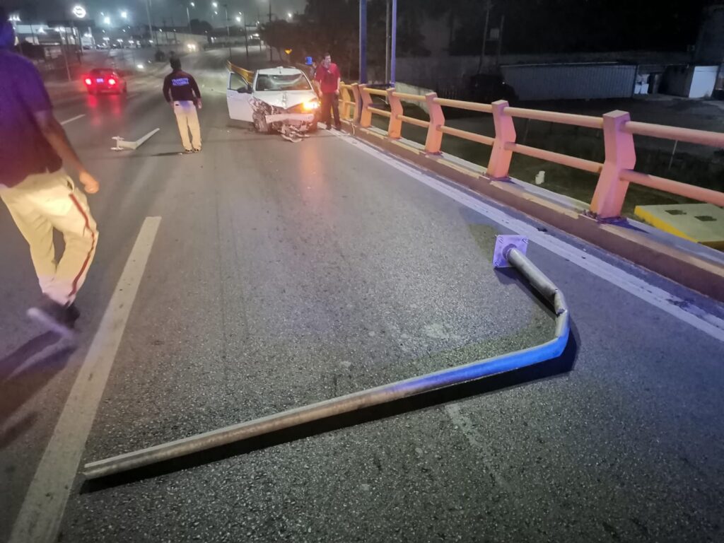 Un auto compacto se impactó contra luminarias y un macetero al circular sobre la parte superior del puente El Barquito, durante la madrugada en Altamira.