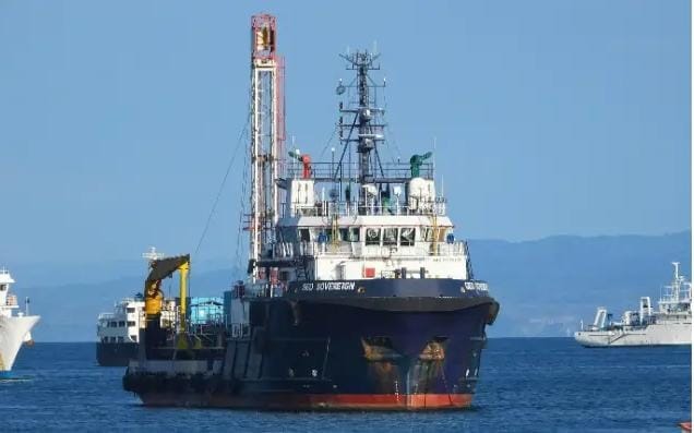 La nave tipo investigación científica “GEO SOVEREIGN”, con número IMO 9376139, 64.320 metros de eslora y 14.950 metros de manga, opera bajo bandera de Kiribati y es propiedad de la empresa Trinity Offshore Pte. Ltd.